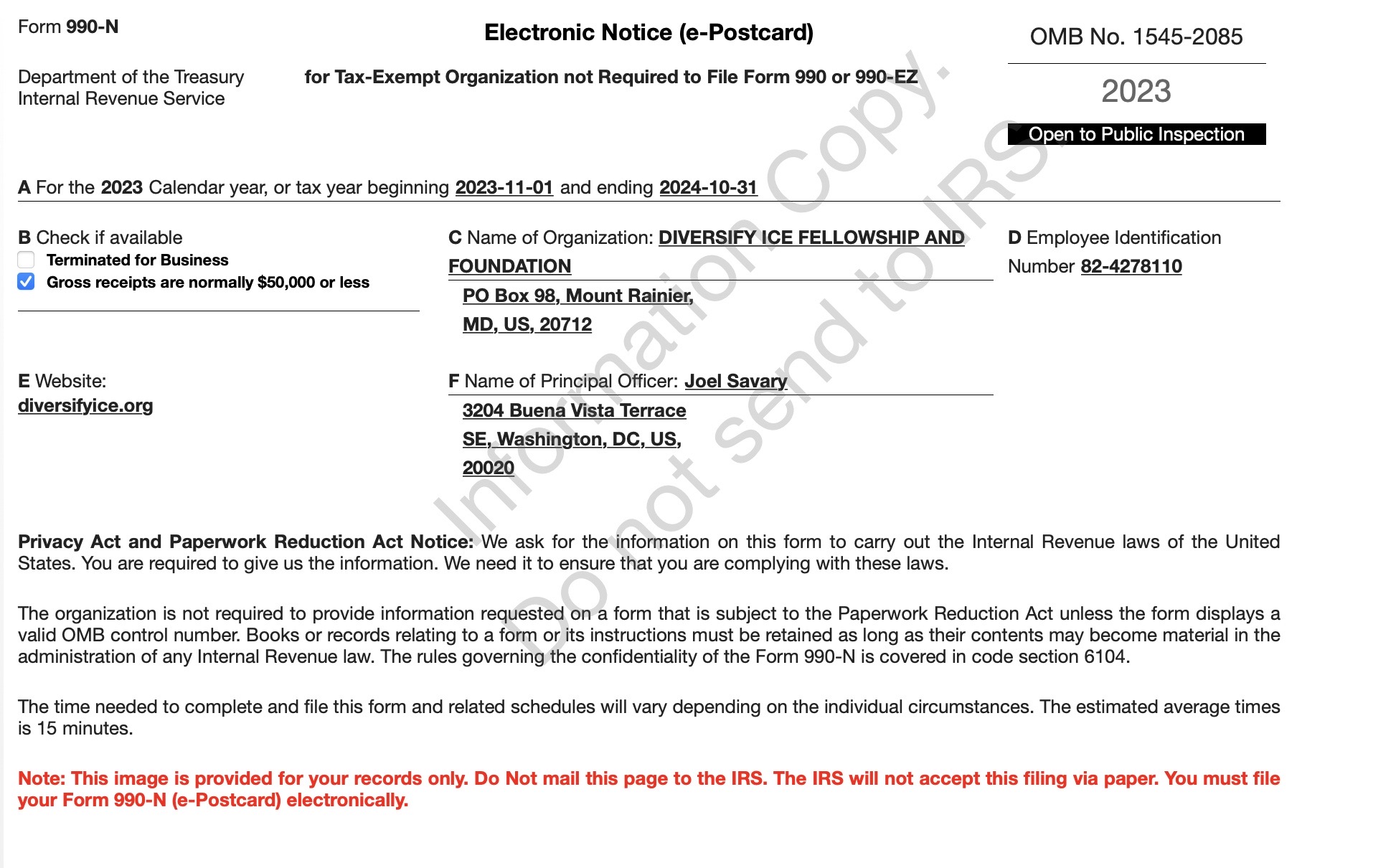 The Diversify Ice Fellowship & Foundation files Form 990-N for each tax year and will be posting copies online. A copy of the 990 have been made available to the public: